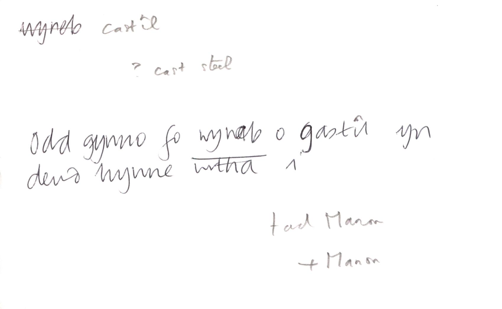 Odd gynno fo wyneb o gastîl yn dweud hynne wrtha i